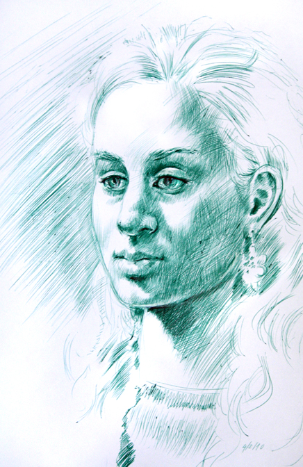 Este foi um dos retratos que me saíram melhor. Ela estava tal e qual (pelo menos a 3/4) e fi-lo com uma calma que não costumo ter nestes casos de desenhar com tinta. Não cheguei a ter de usar o lápis.